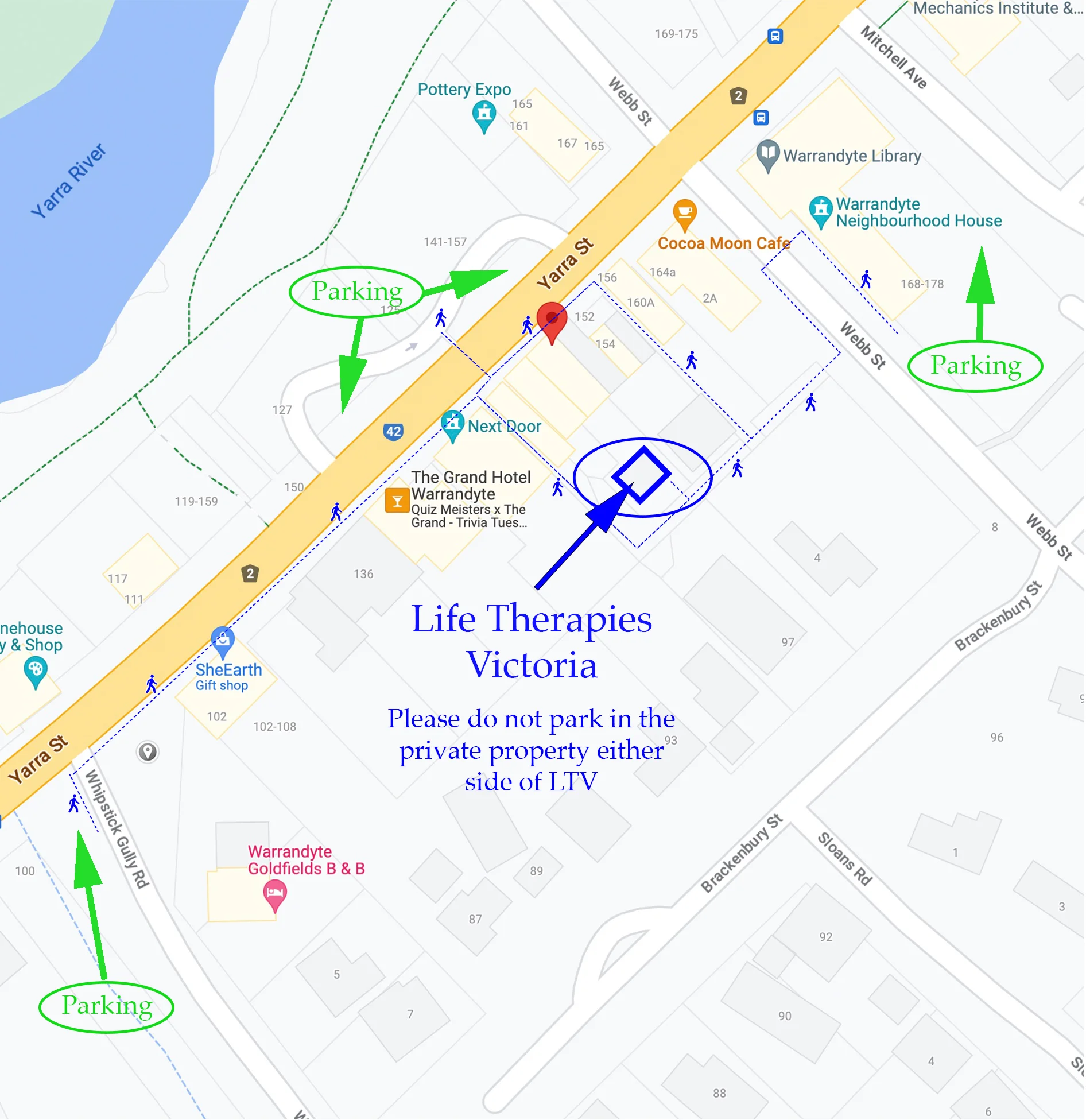 We’re behind the Now and Not Yet Cafe, 148-150 Yarra Street Warrandyte, however the entrance to our driveway is off Webb Street.